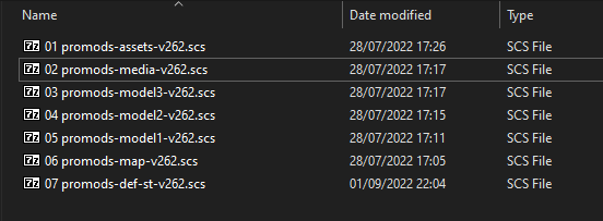 Note que a ordem é invertida em relação ao gerenciador de mods. Sendo assim, o arquivo “01 promods-assets-v262.scs” seria o arquivo que ficaria abaixo no gerenciador de mods (menor prioridade) e o “07 promods-def-st-v262” no topo (maior prioridade e, portanto, o último a ser carregado).